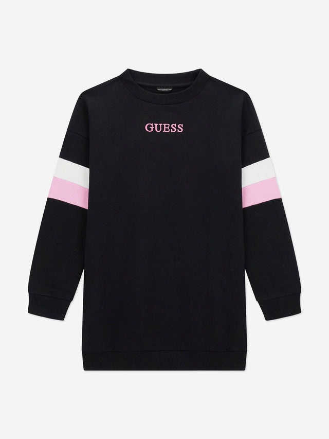 Introducing the chic Girls Logo Sweater Dress in Black by Guess, an essential addition to your little girl's wardrobe. This piece melds sophistication with youthful charm, perfect for stylish outings or cosy days at home. Here are its standout features: