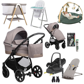 Paired with carefully selected essentials including a bouncer, bedside crib, highchair, thermometer, and play mat, this bundle provides everything you need for life with a newborn — at home and on the go.