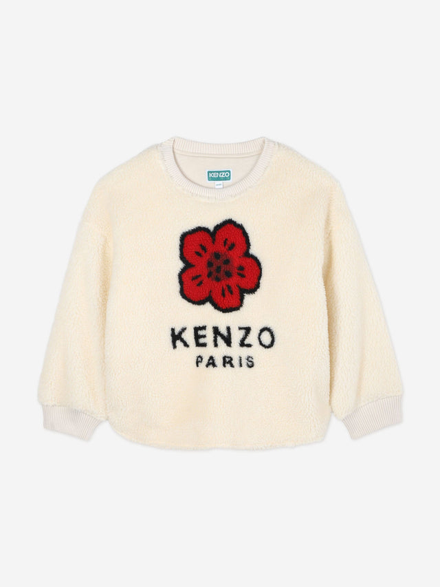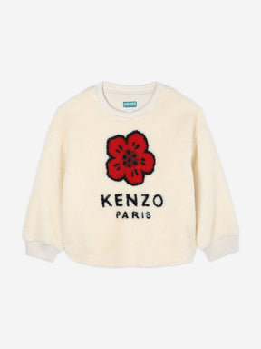 KENZO Girls Faux Shearling Flower Sweatshirt in Ivory