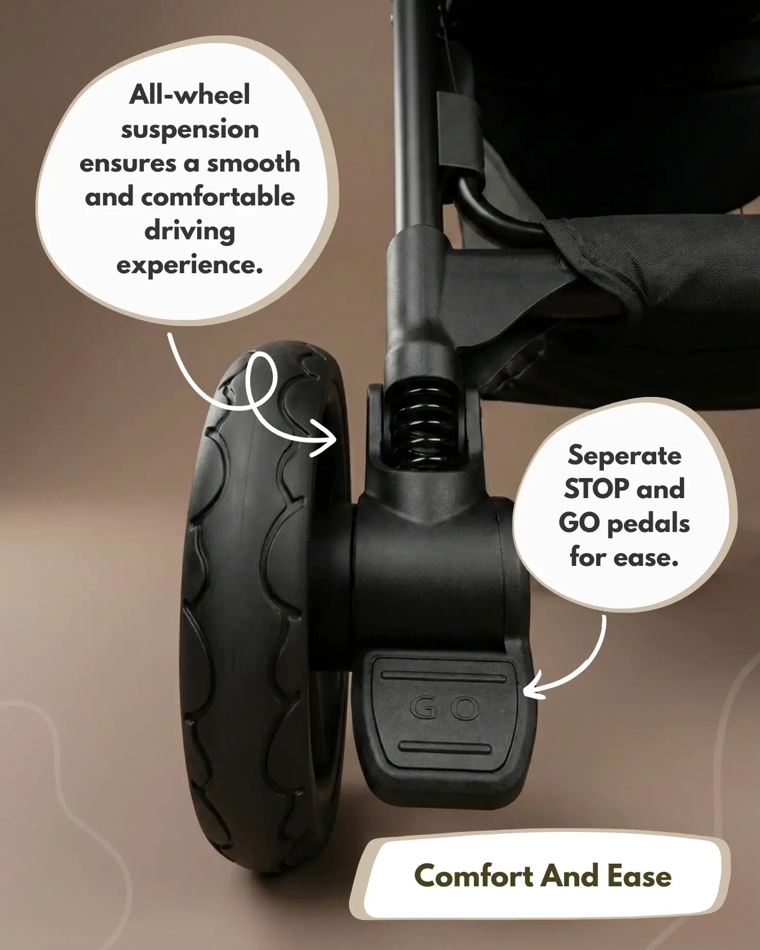 - Smooth, Easy Push - All-wheel suspension with swivel front wheels and lock.